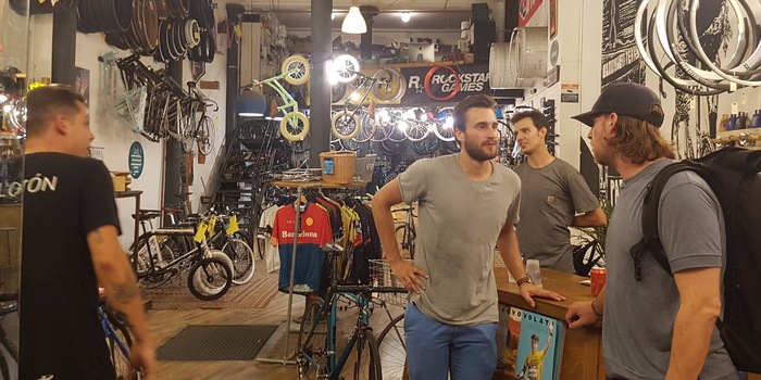 Nico, der Ladenbesitzer, führt uns durch die Gassen in die nächste Bar, damit sein Feierabend richtig beginnt. Vor ein paar Jahren ist er aus Italien nach Barcelona gekommen, hat sich in die Stadt verliebt und wollte ihr mit einem Fixieshop etwas zurückgeben. Was wäre passender als ein Ort wie dieser, wo sich Fixie- und Velo-Freaks treffen können, während ihre zweirädrige Passion geflickt wird? Nico ist erst 27. Wir sind beeindruckt von seinem Werk mit dem passenden Namen «My Beautiful Parking».
