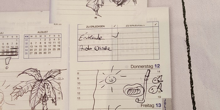 Eine ganz andere Variante, die sich nicht so ohne weiteres digitalisieren lässt, aber nicht minder spannend ist, ist das gezeichnete Tagebuch. Kleine, schnelle Skizzen halten entweder das fest, was der Tag an Erlebnissen gebracht hat oder geben vorausblickend eine Idee davon, was man an einem bestimmten Tag vorhat. Im Rückblick mehrerer Jahre ist ein solches Tagebuch ein Schatz, der an die emotionalsten Momente des Lebens erinnert.