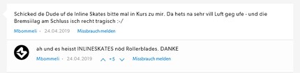 Nun ja, ich hatte Rollerblades an den Füssen. Mit anderen Inline Skates hätte es aber auch nicht besser ausgesehen. Freispruch für alle Blades und Skates dieser Welt. Ich hab's aus Unfähigkeit vermasselt und freue mich über das Angebot.