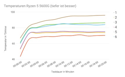 Wie zu erwarten, erreicht die CPU mit der komplett passiven Konfiguration die höchste Temperatur. Nach zwanzig Minuten läuft sie am thermischen Limit. Erstaunlich ist dennoch, dass die CPU während der Testdauer durchschnittlich mit 4,1 GHz taktet. Im besten Fall, der Konfiguration mit Gehäuse-Lüftern und CPU-Lüfter seitlich, taktet die CPU durchschnittlich nur 200 MHz schneller. Die Drosselung der Ryzen 5600G hält sich also in Grenzen. Und wenn ich bedenke, dass die CPU erst nach zwölf Minuten an das thermische Limit gelangt, ist das genial. Ohnehin ist das Ergebnis gut: Die CPU wurde in meinem Review, in dem es in einem Mini-ITX-Gehäuse aktiv gekühlt wurde, maximal knapp 80 Grad Celsius warm. Der Test dort lief aber nur zehn Minuten. Und nach zehn Minuten passiver Kühlung mit dem P1 hatte ich nur 13 Grad Celsius mehr.