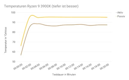 Bei der passiven Konfiguration gerät der Ryzen 9 3900X bereits nach Kurzem an sein thermisches Limit von 95 Grad Celsius. Die CPU taktet darum auch nur mit durchschnittlich 3,5 GHz. Bei der aktiven Konfiguration ist die Temperatur zwar hoch, bleibt mit maximal knapp 89 Grad Celsius innerhalb des thermischen Limits. Die CPU taktet denn auch durchschnittlich mit 4,0 GHz. Die Lüfter dröhnen so aber mit über 48 dB. Das ist alles andere als leise und genau auf diesen Betrieb ist der P1 nicht ausgelegt. Dennoch krass zu sehen, wozu der Kühler in der Lage ist.