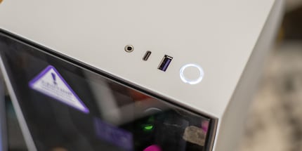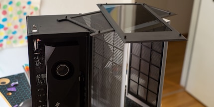 Das H1 ist von drei Panelen umgeben. Das Front- ist aus Glas und das Rückpanel mit Mesh (Gittergewebe) aus Stahl. Dazu gesellt sich ein grosses, u-förmiges Metallteil mit Mesh auf den Seiten und Aussparungen für Power-Knopf und Anschlüsse. Auf der Innenseite des u-förmigen Teils sind Staubfilter mit Magneten angebracht. Solche fehlen beim Mesh-Panel auf der Rückseite. Das ist nicht tragisch, da frische Luft nur auf den Seiten reinkommt und die Rückseite als Auslass fungiert. Bei den Anschlüssen der Oberseite stehen je einmal USB 3.2 Gen 2 Type-C, USB 3.2 Gen 1 Type-A sowie ein Klinkenanschluss zur Verfügung.