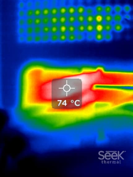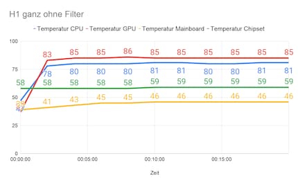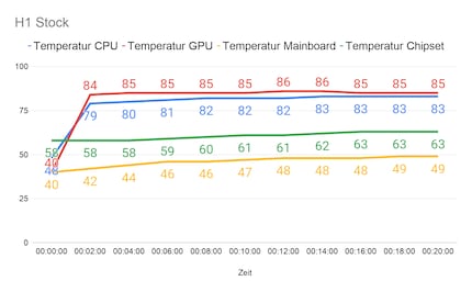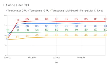 Nach jeweils zwei Minuten notiere ich die Temperaturen. Nach den Tests schalte ich das System jeweils ab und lasse es abkühlen.