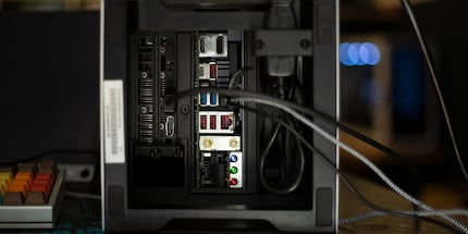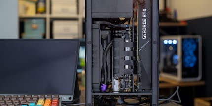 Hinter einer entfernbaren Blende verbergen sich das vollmodulare Netzteil und zwei 2.5-Zoll-Laufwerkeinschübe. Die Laufwerke werden eingeschoben und von einem Mechanismus an Ort und Stelle gehalten, du benötigst kein Schrauben. Alle Kabel sind bereits vorinstalliert, sauber verlegt und auf die richtige Länge getrimmt – zumindest beinahe: Beim 24-Pin-Kabel des Mainboards muss ich etwas gar arg ziehen, damit ich es auf dem Mainboard befestigen kann. Bei den Kabeln ist alles Nötige vorhanden, damit die maximal mögliche Hardware eingebaut werden kann. Dazu gehören zwei 6/8-polige PCIe-Stromanschlüsse für die GPU, ein einzelner 8-poliger CPU-Anschluss, ein 24-poliger ATX-Anschluss und ein Paar SATA-Stromanschlüsse.