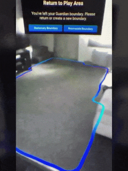 Danach richtest du deinen Spielbereich ein und das ist ein echtes Highlight. Als erstes bestimmst du, ob du stationär spielen willst oder dich im Raum bewegen möchtest. Für Variante Eins reicht ein Klick und du kannst loslegen. Für Variante Zwei tippst du kurz mit dem Controller den Boden an falls die Brille diesen nicht bereits selber erkannt hat. Anschliessend zeichnest du in dem du den Controller gedrückt hältst deinen Spielbereich ein. Das geniale dabei ist, dass du dank den integrierten Sensoren eine externe Kamera erhältst. Die ist zwar niedrig aufgelöst und nur schwarz weiss, das reicht aber allemal. Das Ganze funktioniert extrem intuitiv. Die Brillen merken sich sogar, wo im Zimmer du dein Spielfeld aufgestellt hast. Wenn du die Brille beiseite legst und später weiter spielst, kannst du einfach zurück in deinen «Pferch» gehen. Die Kamera wird übrigens automatisch aktiv, wenn du dich einem Hindernis näherst, damit du rechtzeitig ausweichen kannst – zumindest fast immer.