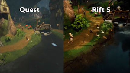 Am offensichtlichsten siehst du den Unterschied in «Moss». Die Level bestehen aus Dioramas durch die du eine kleine Maus navigierst. Dadurch, dass sich das Bild kaum bewegt und die Grafik sehr detailliert ist, fallen die Unterschiede deutlich auf. Bereits in der ersten Szene, in der du dein eigenes Spiegelbild anschauen kannst, merkst du, dass die Wasseroberfläche bei der Quest matt ist. Auf der Rift S sieht das Wasser glänzig und wesentlich realistischer aus. Auch der Rest der Welt ist mit der Quest viel weniger detailliert. «Moss» sieht aber immer noch gut aus auf der Quest. Nur nach dem Direktvergleich fällt es etwas schwer, zurückzukehren.