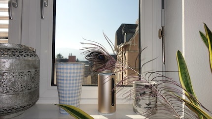 Die Pet Cam & Play fällt auf meinem Fenstersims, neben all den Vasen und Kerzen, kaum auf.Nun nehme ich behutsam die Cam aus der Schachtel heraus, verbinde das Stromkabel mit dem Netzanschluss und stelle sie an einen geeigneten Platz. Da sich mein Hund hauptsächlich in der Stube aufhält, wähle ich einen Fenstersims aus, der einen guten Blick auf das Geschehen freigibt. Ich henke das Gerät an den Strom und es kann losgehen. Die Cam beginnt sich zu drehen und surrt dabei leise. Via Bluetooth verbinde ich mein Handy damit. Jetzt kann das Observieren losgehen.