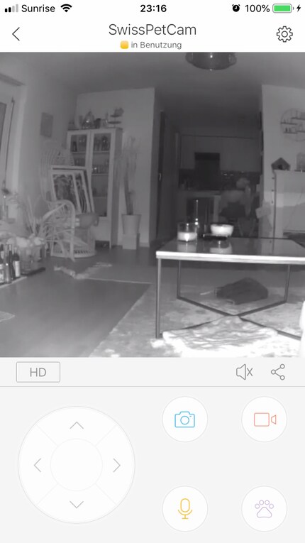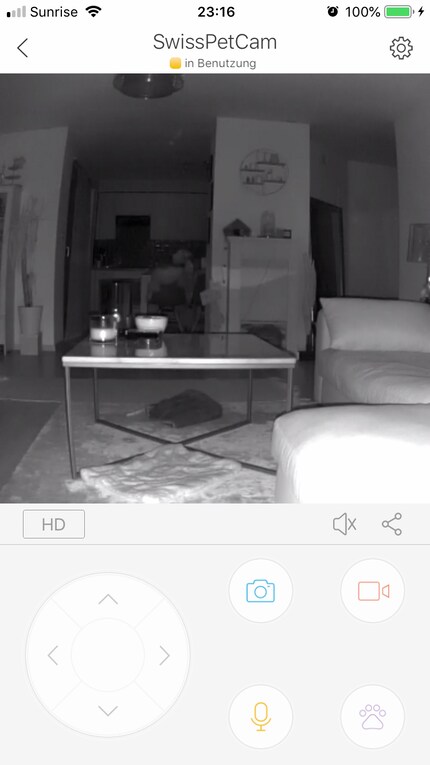 Mithilfe der Navigationspfeile lässt sich die Haustierkamera via App drehen und schwenken.Auf dieses Feature bin ich besonders gespannt, da ich es ein Plus finde, wenn ich meinen Kleinen im Dunkeln sehen kann. Gespannt schaue ich in der Nacht auf dem Bildschirm meines Handys nach und siehe da: Ich kann tatsächlich etwas erkennen. Diese Funktion ist meiner Meinung nach kein Muss aber nice to have, wenn ich mal am Abend auswärts essen gehen und währenddessen nicht die ganze Zeit das Licht brennen lassen will. Top!