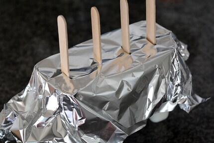 Schritt 4: Schneide ein Stück Alufolie ab, falte es doppelt und bedecke nun die Öffnung der Eisformen damit. Schneide dann über jede Öffnung mit einem spitzen Messer einen Schlitz in die Folie rein, durch welchen du den Stiel stecken kannst.