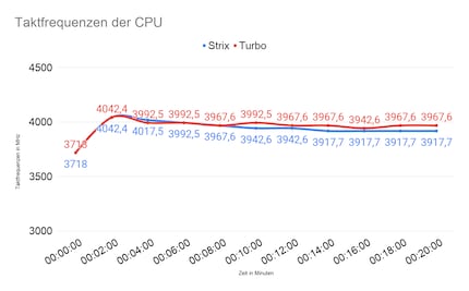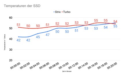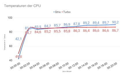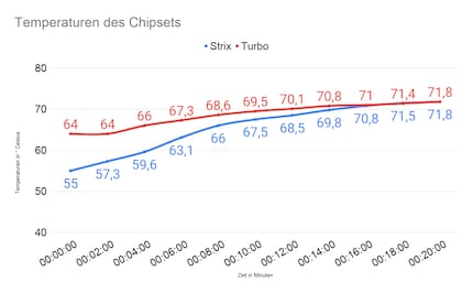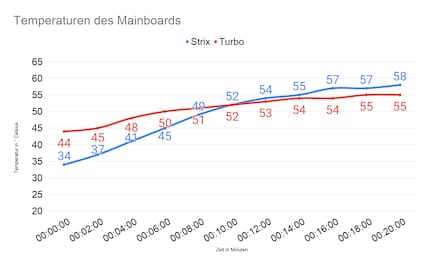 Ich mache den Test mit der Strix erneut, schalte aber den Ausstosslüfter ab. Da die heisse Luft so von den Axiallüftern der Strix nicht nach aussen transportiert wird, erhitzen sich die Komponenten im Inneren mehr. Die GPU stösst nach zehn Minuten ans thermische Limit von 87° Celsius. Auch die CPU läuft nach 14 Minuten an ihrem thermischen Limit von 95° Celsius. Die anderen Komponenten sind bis zu sieben Grad Celsius heisser als beim ersten Durchgang. Wiederhole ich den Test ohne Ausstosslüfter mit der Turbo, sind die Temperaturen nur unwesentlich höher als beim Test mit Ausstosslüfter. Die CPU erreicht maximal 88° Celsius. Auch die übrigen Komponenten sind nur zwei Grad Celsius wärmer. Die GPU ist wie zuvor mit 87° Celsius am Limit. In diesem Fall schlägt die Turbo die Strix klar aufgrund der tieferen Temperaturen der restlichen Komponenten.