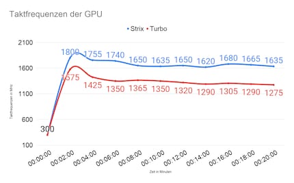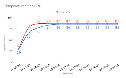 Die Turbo erreicht beim Test ihr thermisches Limit von 87° Celsius. Die Strix liegt mit 86° Celsius knapp darunter. Die Turbo ist bereits nach vier Minuten auf ihrer Maximaltemperatur angekommen. Bei der Strix dauert es acht Minuten, bis sie die 86° Celsius erreicht. Die Taktfrequenz bricht bei der Turbo viel früher ein als bei der Strix. Ganze 300 MHz büsst die Karte mit Radiallüfter in den 20 Minuten ein. Bei der Strix sind’s lediglich 165 MHz.