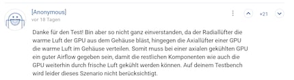Der Vergleich ist nicht repräsentativ für die Verhältnisse in einem Gehäuse, weil ich ihn auf unserer Testbench gemacht habe. Deshalb schneidet die Grafikkarte mit drei Axiallüftern, die ich gegen die Karte mit Radiallüfter habe antreten lassen, besser ab. User Anonymous kritisiert mein Vorgehen zurecht: