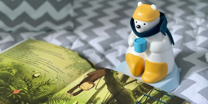 Sami ist quasi ein Vorlese-Roboter in Form eines Plastik-Eisbärs und richtet sich an ein Publikum zwischen drei bis sieben Jahren – wir sind also seine perfekte Zielgruppe. Mit gelber Mütze, hohen gelben Winterstiefeln und dunkelblauem Stoff-Schal sitzt er auf einer Eisscholle und hält seine Teetasse in der Pfote. Zweifellos, Sami ist ein herzerwärmender Teamkollege. Aber wie sind seine Vorlese-Qualitäten? Bevor er fix eingestellt wird, muss er zum Assessment bei seinen neuen Vorgesetzten antreten – meinen Kindern und mir.