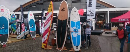 Schon bei der Ankunft an der Messe war der Paddel-Trend unmittelbar zu spüren: Im kleinen Teich vor dem Messegelände waren die Ersten bereits früh am Morgen am Yogamachen auf ihren Stand Up Paddels. Auch auf dem Messegelände waren mehrere Stände mit SUPs vertreten und überliessen diese den Besuchern sogar zum Test in den Pools der Aussenanlage.