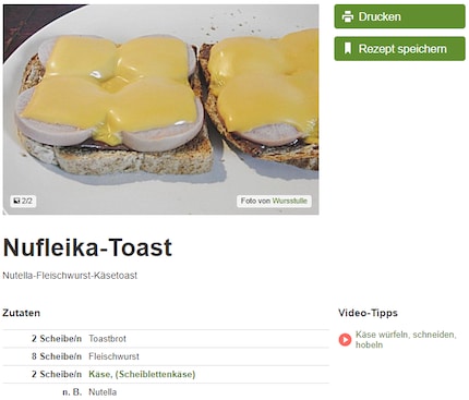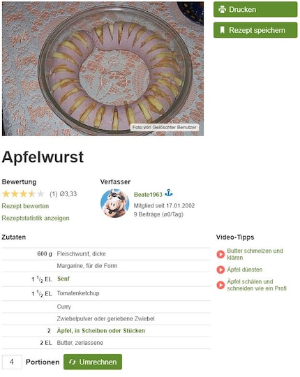 Alle anzeigen«Jetzt wird das Moped im Ofen auf geil kalibriert und wir sehen uns in 15 Minuten» sagt Löffelbein vor der Pause und schiebt die «Apfelwurst» in den Ofen. Zuvor hat er eine ganze Lyoner-Wurst mit Schlitzen versehen, die Schlitze mit Ketchup und Senf gefüllt und Apfelschnitze reingesteckt. Das Rezept von Userin «Beate1963» ist nur die Spitze des Eisbergs. Auf ihrem Blog präsentieren die Zwei Rezepte, die nur als «Vergehen an der Menschheit» bezeichnet werden können.