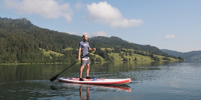 Wenn du nun denkst, «einen gepolsterten Rucksack hätten sie dem Airboard trotzdem spendieren können», dann sei dir gesagt: Es gibt einen Grund dafür, dass er so ist wie er ist. Und zwar einen guten. Der Packsack ist ein PumpBag, mit dem du schnell Volumen ins Board bringen kannst. Um am Ende auf den entsprechenden Druck zu kommen (0.8 - 1.2 bar), reicht dann eine kleine Pumpe, die für noch weniger Gepäck sorgt. Oder das PumpPaddle, mit dem du am See staunende Blicke ernten kannst. Halt, nein. An deinem einsamen Ufer ist ja keiner.