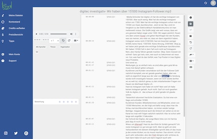 Wenn die sprechende Person wechselt, beginnt ein neuer Abschnitt mit Timecode, sodass du die Stelle direkt hören kannst. Ein Doppelklick auf eine Textstelle startet ebenfalls den Ton an der entsprechenden Stelle. Die Geschwindigkeit ist sehr fein von 0,1-fach bis 3,5-fach wählbar.