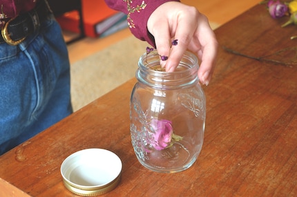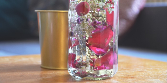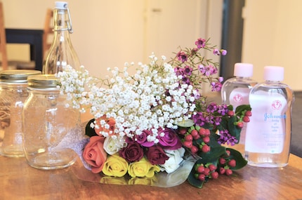 Achte bei der Wahl der Pflanzen darauf, keine mit zu hohem Wassergehalt zu nehmen, da das Trocknen relativ schwierig wird. Tulpen sind eher ungeeignet, Rosen und Kräuter prädestiniert. Ich habe mich für Rosen, Schleierkraut, Waxflower und Johanniskraut entschieden. Für die konservierende Flüssigkeit in der Flasche oder dem Glas wird meistens auf reines Paraffin zurückgegriffen. Da dieses aber der Hauptbestandteil von Babyöl ist, sollte auch dieses gut funktionieren.