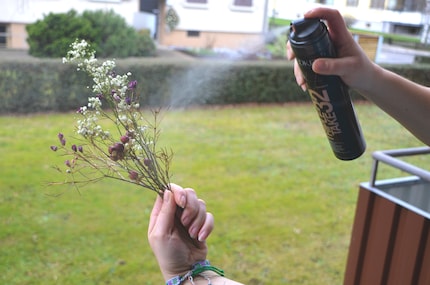 Als Erstes müssen die frischen Blumen getrocknet werden. Oder du kaufst sie gleich getrocknet, wenn Zeit Mangelware ist. Am schonendsten und schönsten trocknen die Pflanzen an der Luft. Binde dir dafür ein Sträusschen deiner Wahl, halte es mit Gummiband oder Schnur zusammen und suche dir ein warmes, gut durchlüftetes sowie dunkles Plätzchen. Dort hängst du den Bund kopfüber auf und lässt ihn zwei bis drei Wochen hängen.
