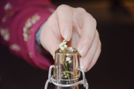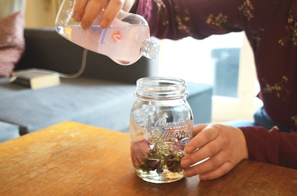 Sobald ich mit dem Anblick im Rohzustand zufrieden bin, kommt das Babyöl ins Spiel. Mit ihm wird das gläserne Gefäss bis oben hin gefüllt. Mach das nicht zu schnell, damit sich die Blümchen schön verteilen und nicht gleich ertränkt werden. Wenn du mit dem Anblick dennoch nicht zufrieden bist, kannst du die geschlossene Flasche zum Schluss noch ein paarmal drehen, um die Komposition zu ändern.