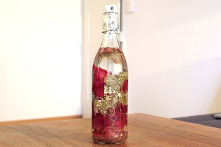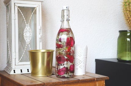 Und diese habe ich ganz zufällig bei etwas Internetrecherche gefunden: das japanische Herbarium. Das sind getrocknete Blumen, die in einer konservierenden Flüssigkeit schwimmen. Drapiert werden diese meistens in einer Glasflasche. Auf Etsy wird es zusammen mit anderen Formen von haltbaren Blumen schon als Trend 2019 angepriesen. Kollegin Natalie Hemengül bewies einen guten Riecher und hat schon vor einiger Zeit Bilder aus gepressten Blumen gemacht. Ich nehme mich heute der dreidimensionalen Variante aus Japan an. Viel eingekauft werden, muss dafür nicht: Blumen, Babyöl und eine Glasflasche genügen.