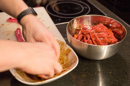 Hast du alle Zutaten für die Marinade zusammengefügt, streichst du jeden Fleischstreifen kurz durch und legst ihn in eine Schüssel oder einen Gefrierbeutel. Die marinierten Streifen kommen anschliessend in den Kühlschrank. Ich habe das Fleisch über Nacht etwa 12 Stunden einwirken lassen. Je länger du diesem Vorgang Zeit gibst, desto intensiver nimmt das Fleisch den Geschmack der Marinade an.