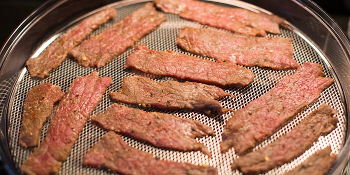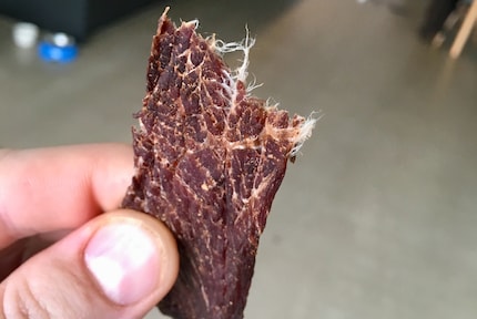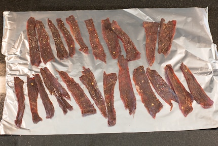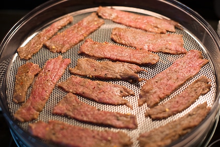 Zwischen den Streifen solltest du genug Abstand halten.Da meine Streifen leider nicht alle genau gleich dick sind, kontrolliere ich nach und nach dessen Konsistenz. Das Beef Jerky ist fertig, wenn sich beim Biegen der Streifen leichte Risse bilden, das Fleisch jedoch nicht zerbricht. Meine dünnsten Streifen waren bereits nach dreieinhalb bis vier Stunden fertig, wobei die dicksten Stücke bis zu sechs Stunden im Dörrgerät verbringen mussten.