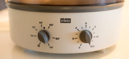 Dörrgerät mit Temperatur- und Zeitregler.Vor dem Trocknen solltest du die Marinade abtupfen.Zu diesem Zeitpunkt habe ich nochmals grosszügig Pfeffer über das Fleisch gestreut. Die Pfefferkörner musst du anschliessend ein wenig in das Fleisch drücken, da sie ansonsten nach dem Trocknen gleich wieder abfallen.