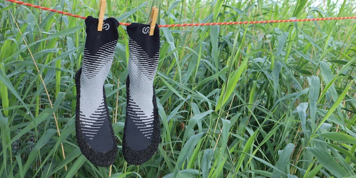 Kaum sass ich im Zug, zog ich die Skinners an. Die minimalistischen Schuhsocken fühlen sich sehr weich und bequem an und bieten dank der breiten Zehenbox genug Raum für breite Füsse. Am Fussgelenk und an den Waden spüre ich die Kompression. Das ist angenehm und gibt extra Halt. Eine perforierte Einlegesohle sorgt für Komfort. Sie kann aber auch herausgenommen werden, um den Boden noch besser zu spüren.