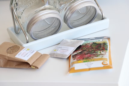 Auf der Rückseite der Anleitung befindet sich übrigens eine Tabelle, die mir für unterschiedliche Samen zeigt, wie lange die jeweilige Einweich- und Keimdauer beträgt. Für schleimbildende Saaten wie Rucola, Kresse oder Leinsamen sind die Sprossengläser nicht geeignet. Da greifst du lieber zu einem Kressesieb.