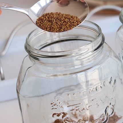 Ich gebe einen Esslöffel der Alfaalfa-Keimsaat in den Glasbehälter. Dann fülle ich ihn zu etwa einem Viertel mit Wasser auf und lasse die Samen darin acht Stunden einweichen. Anschliessend giesse ich das Wasser durch den Siebdeckel wieder ab, schüttle die Samen kurz, damit sie nicht am Sieb kleben und stelle das Glas mit dem Deckel nach unten ins Abtropfgestell. Auf diese Weise kann die befeuchtete Saat atmen und das überschüssige Wasser tropft in die Keramikschale. Von nun an, während der Keimzeit von sieben bis zehn Tagen, ist Disziplin gefragt: Immer morgens und abends spüle ich die Gläser einmal kurz mit Wasser durch, um die Saat feucht zu halten und stelle sie anschliessend wieder zurück. Um meine erste Ernte nicht aufs Spiel zu setzen, nehme ich das Glas sogar mit, während ich das Wochenende ausser Haus verbringe.