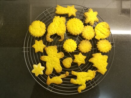 Durch das erneute Kneten sieht der Teig etwas besser aus.Dennoch gefällt mir die Farbe nicht. Neongelb. Schrecklich! Und auch sonst sind sie mir zu knackig. Ich teste sie an meinen Kollegen in der Firma aus.