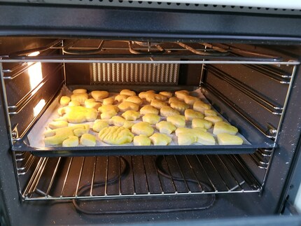 Die brauchen noch eine Weile.Endlich kommt das erste Blech in den mit 200 Grad vorgeheizten Backofen. Nach 16 Minuten, anstelle der üblichen 12 Minuten, ist das erste Blech durch.