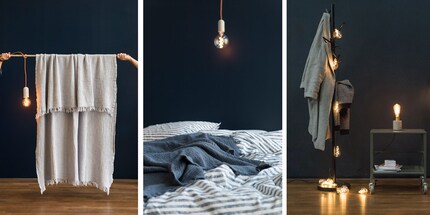 Ein Schlafzimmer mit industriell-modernem Charme: Die Beton-Elemente an den Leuchten bilden einen schönen Kontrast zu den soften Textilien im Raum. Filament-Leuchtmittel sorgen für Vintage-Flair im Raum und eine behagliche Stimmung.«Get the Look» – diese Elemente dürfen nicht fehlen: