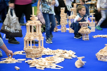 Auf einem riesigen blauen Teppich liegen Tausende Bauklötze von Kapla zur freien Verfügung herum. Hier kannst du deiner Kreativität freien Lauf lassen. Sei es nun einen Nachbau des Bundeshauses oder einen Turm, der bis an die Hallendecke ragt. Klötze hat es genügend für beide Projekte.