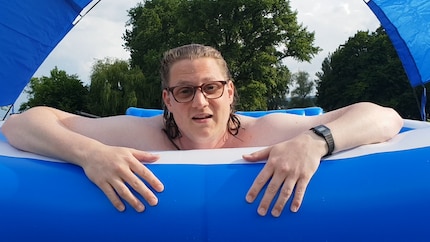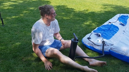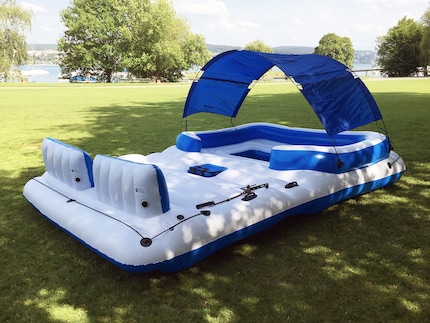 Das Luftschloss fürs Wasser trägt den Namen «Tropical Breeze». Ich habe mir das 4x3 Meter grosse Floss geschnappt, bin damit an den See und hab mir beim Aufpumpen die Seele aus dem Leib geschwitzt.