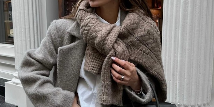 Der Look ist gerade jetzt im Winter beliebt, da ein Pullover auf diese Weise auch als Schal getragen werden kann. Sogar auf den Laufstegen war der Pulli-Schal zu sehen. Etwa in den Shows von The Row und Lemaire für die aktuelle Saison oder in der kürzlich vorgestellten Herbst-/Winterkollektion 2024 von Auralee.
