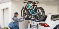 Die schlauste und sicherste Lösung für Autos mit Anhängerkupplung sind Trägersysteme, die du direkt auf den Kugelkopf montieren kannst. Damit ist der Transport von bis zu vier Velos möglich. Das Verladen der Zweiräder ist leicht, weil du sie nur ganz wenig in die Höhe heben musst. Zudem kostet dich diese Art des Transports am wenigsten zusätzlichen Treibstoff, weil sich der Luftwiderstand während der Fahrt am wenigsten von allen Lösungen erhöht. Weil die Velos nah an der Heckklappe transportiert werden, kannst du diese erst öffnen, nachdem du die Velos weggeklappt hast. Und auch dann ist der Zugang noch eingeschränkt, weil der Träger auf Höhe deiner Knie oder Schienbeine ist und du nicht nah an der Ladekante stehen kannst.