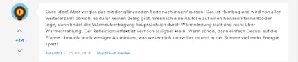 Ich habe in einem Artikel behauptet, die glänzende Seite der Alufolie strahle Wärme besser ab. Glänzend oder matt spielt keine Rolle, sagt User RefardtD und hat recht. Eine Berichtigung.