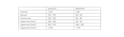Einteilung der Blutdruck-Werte gemäss WHO (Weltgesundheitsorganisation) in mmHg: