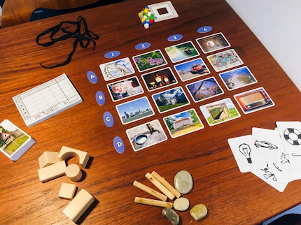 Welches Material-Set darf’s denn sein? Bauklötze, Symbolkarten, Bänder, bunte Holzquader oder doch Steinchen und Stäbchen? Es kommt zu einem Gerangel um die Bauklötze, aber nur wenig Nachfrage bei den Bändern. Doch so unterschiedlich die Gegenstände auch sein mögen, mit denen man die Bilder nachstellen soll, tückisch sind sie alle, jedes Set auf seine Art. Wie formt man einen Bären auf einem Baumstamm allein mit zwei schwarzen Schnürsenkeln? Wie soll aus sechs unterschiedlichen Bauklötzen ein Riesenrad werden? Und wie aus vier runden Steinen und vier länglichen Holzstäben eine Fußspur im Sand? Man muss sich die detailreichen Fotos schon sehr genau ansehen, um Farben, Formen und Strukturen zu entdecken, auf die sich das ganze Große möglichst deutlich herunterbrechen lässt. Je geschickter das Händchen, das man bei der Nachgestaltung hat, desto besser: Punkte bekommt nicht nur derjenige, der richtig rät, sondern auch derjenige, dessen Bilder erraten wurden. Nach jeder Runde wandern die Gegenstände weiter. Jeder muss mal mit jedem Set werkeln. Keiner hat so durch vermeintlich leichteres Material Vorteile. Alles geht gerecht zu.