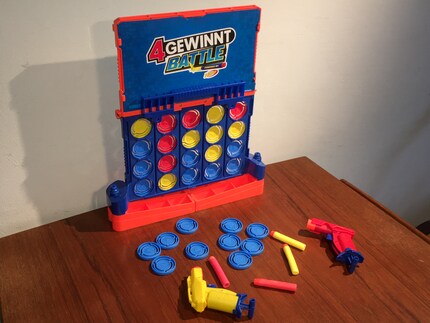 Wer kann einem Neunjährigen schon einen Wunsch abschlagen? Und so steht nun also eine etwas größere, etwas stabilere Variante der altbekannten blauen «Vier gewinnt»-Apparatur im Kinderzimmer. In allen 20 Löchern stecken blaue Scheiben. Oben auf dem Gitter steckt wiederum ein zweites Gitter mit je zehn gelben und roten Scheiben, wild und wahllos gemischt – und vor allem von einer Pappe verdeckt. Mit zwei winzigen Pistolen – oder vielmehr Nerf-Blastern – sollen die blauen Scheiben unten aus dem Gitter geschossen werden, so dass von oben nach und nach gelbe oder rote Plastikscheiben nachrutschen können. Natürlich kann man jederzeit auch die Scheiben seines Gegners aus der Halterung befördern. Mit Zielgenauigkeit und ebenso viel Glück gelingt es einem der zwei Schützen eines schönen Tages eine Reihe aus vier Steinen seiner Farbe zu bilden. Doch das kann dauern!
