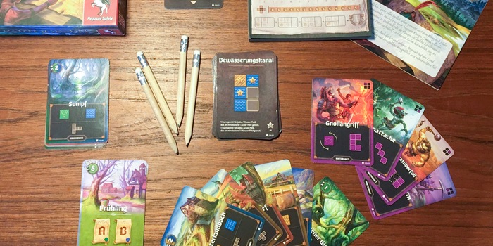 Ein dicker Block, beidseitig mit besagten Landkarten bedruckt, und allerlei Stapel mit bunten Spielkarten unterschiedlichster Kategorien: Wertung, Erkundung, Dekrete, Jahreszeiten, Hinterhalte, Fertigkeiten… Auweia! Doch was einen im ersten Moment überfordert, gewinnt schnell an Klarheit. Jeder Mitspieler muss Landschaften wie Wald, Dorfgebiet oder Gebirge nach bestimmten Vorgaben irgendwo auch seiner Karte einzeichnen. Wo und wie genau, bleibt jedem selbst überlassen. Da muss dann beispielsweise ein L-förmiges, vier Kästchen umfassendes Ackerland eingetragen werden – gleichzeitig muss die Punktewertung berücksichtigt werden: «1 Punkt für jedes Acker-Feld, das an ein Wasser-Feld grenzt». Von Runde zu Runde kommen neue Landschaften hinzu, die Karte füllt sich, der freie Platz wird weniger, zunehmend wird es schwieriger, Vorgaben zu erfüllen und Punkte zu ergattern. Wird eine Spielkarte mit einem Hinterhalt aufgedeckt, muss jeder seine Landkarte einem Mitspieler übergeben, der dort «Monster»-Felder eintragen darf, die für Punktabzug sorgen und einem in der Gesamtwertung schaden. Überhaupt die Gesamtwertung: Es müssen viel und oft Punkte gezählt werden in «Der Kartograph». Doch der Vergleich der Zwischenstände sorgt sofort für neue Spannung – ähnlich wie Rundenzeiten bei einem Formel-Eins-Rennen.