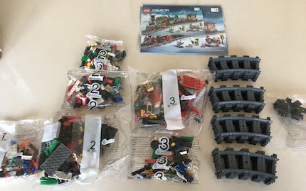Leider weiss ich nicht, ob hier die Ersatzteile ebenfalls dazu zählen. Ich schütte den Verpackungsinhalt auf den Tisch. Es sind sechs nummerierte Beutel, vier Packungen Schienen, ein unnummerierter Beutel mit irgendwas Magnetisches und natürlich die überschaubare Gebrauchsanleitung.