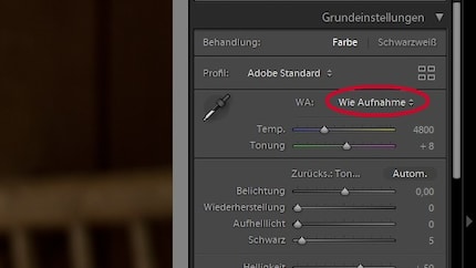 Die Buttons bewirken aber nicht immer etwas. Wahrscheinlich hat Affinity Photo das Bild bereits automatisch angepasst. Oder doch nicht? Ich weiss es nicht, weil Affinity Photo mir nicht sagt, was es tut. Nehmen wir als Beispiel den Weissabgleich. In Photoshop oder Lightroom wird das Bild standardmässig mit den Einstellungen geöffnet, die die Kamera mitliefert. Die Kamera hat ermittelt, dass für ein Foto der perfekte Weissabgleich bei 4800 K und die Grün-Magenta-Balance bei +8 steht. Dies wird so angezeigt, mit dem Vermerk: «Wie Aufnahme». Nun kann ich auf «Automatisch» wechseln, und Lightroom so dazu bringen, selbst den idealen Wert zu errechnen.