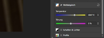 In Affinity Photo wird ein Wert angezeigt, der ungefähr dem Aufnahmewert entspricht, aber nicht genau. In diesem Fall ist es 4847 K und 0 auf der Grün-Magenta-Skala. Ich kann hier nicht zwischen automatisch oder Kameraeinstellung wählen und darum ist mir nicht klar, was hier eigentlich läuft. Ich weiss nicht einmal, ob das ein Bug ist oder vom Hersteller so gewollt. Falls es so gewollt ist, wüsste ich gern, was die Idee dahinter ist.