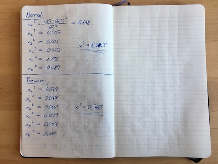 In einem Brettspiel-Forum finde ich einen Beitrag darüber, wie ich ausrechnen kann, ob ein Würfel gezinkt ist oder nicht. Die Rechnung, die angewendet wird, ist die des Chi-Quadrat. Ein Test aus der mathematischen Statistik, mit dem geprüft werden kann, ob die vorliegenden Daten gerecht verteilt sind. Statistische Berechnungen waren mir bisher unbekannt. Das passiert halt, wenn man was mit Medien studiert. Ich versuche mich trotzdem an die Gleichung.