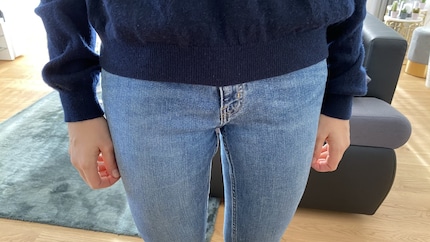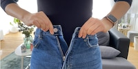 Meine erste Schrankleiche ist eine Jeanshose, die mir am Bund viel zu weit ist. Da ich kein Fan von Gürteln bin, kommt bei mir Trick 17 zum Zug, für den ich keine weiteren Hilfsmittel benötige: Bevor ich meine Hose wie immer schliesse, ziehe ich den Knopf durch die erste Gürtelschlaufe, die sich rechts davon befindet. Anschliessend führe ich ihn wie gewohnt durchs Knopfloch. That’s it: Deine Denim sitzt sofort viel enger. Der Clou: Mit dieser Methode lässt sich deine Hose jederzeit – zum Beispiel nach einem üppigen Essen nach den Festtagen – wieder ausweiten.