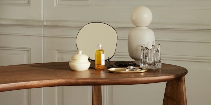 Präsentiere Parfümflaschen, Make-up-Pinsel und andere Accessoires zur Abwechslung in schimmernden Glasvasen statt in den 08/15-Plexiglas-Aufbewahrungslösungen. So kannst sie auch mal zwischen Büchern, Vasen oder anderen Skulpturen einreihen. Für Lichtreflexe sorgen auch Spiegel. Arrangiere Flakons und Schmuck einfach vor einer hängenden Variante an der Wand oder einem Kosmetikspiegel, der Schmuck-Elstern wie mich anziehen würde.