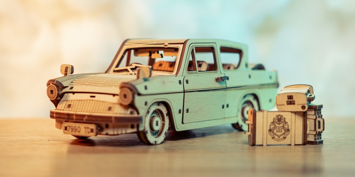 Um meine Chancen auf Erfolg ein wenig zu erhöhen, nehme ich diesmal ein etwas kleineres Set: den fliegenden Ford Anglia aus Harry Potter vom ukrainischen Hersteller Ugears. Er hat 246 Einzelteile und sollte damit halb so herausfordernd sein wie der Jeep. Wie bei Harry Potter soll auch das Modellauto sein Eigenleben haben und die Insassen samt Gepäck herausschleudern können. Mal schauen, ob ich das hinkriege.